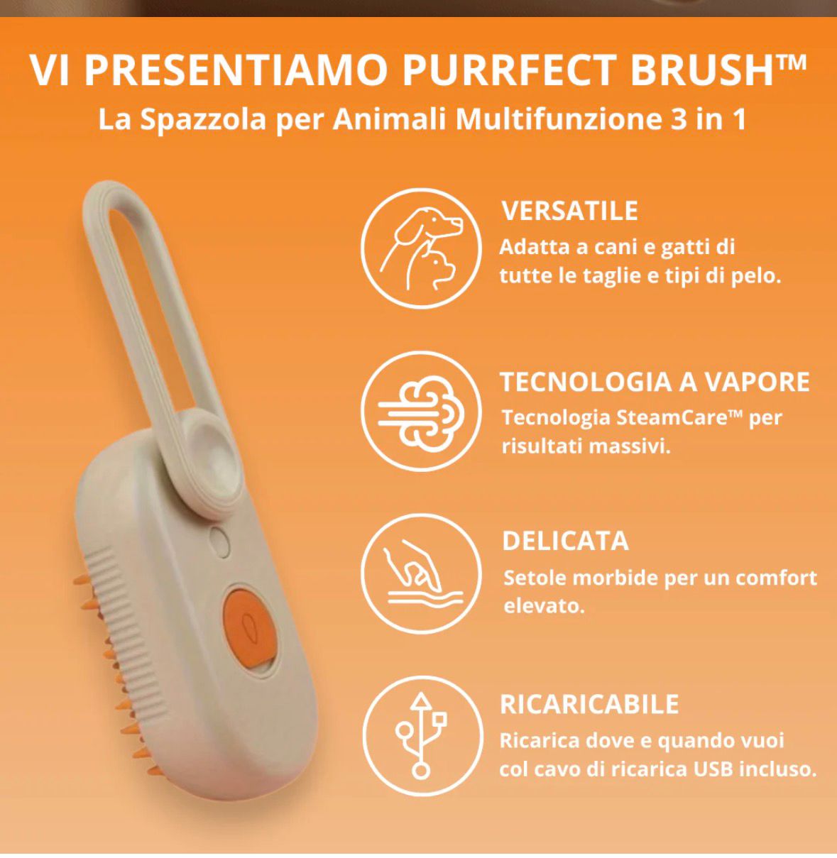 Una spazzola innovativa dal design compatto e moderno, pensata per la cura quotidiana del pelo del tuo cane. Dotata di setole arancioni e pulsante centrale, offre una pulizia delicata ed efficace. Il display digitale mostra lo stato di carica, garantendo un utilizzo pratico e sempre sotto controllo. Perfetta per mantenere il manto lucido e sano con un tocco di stile.